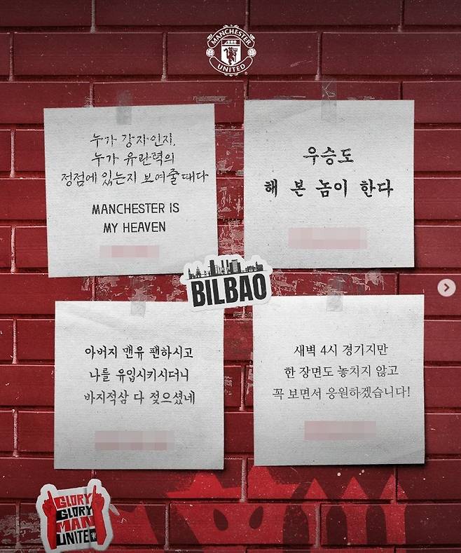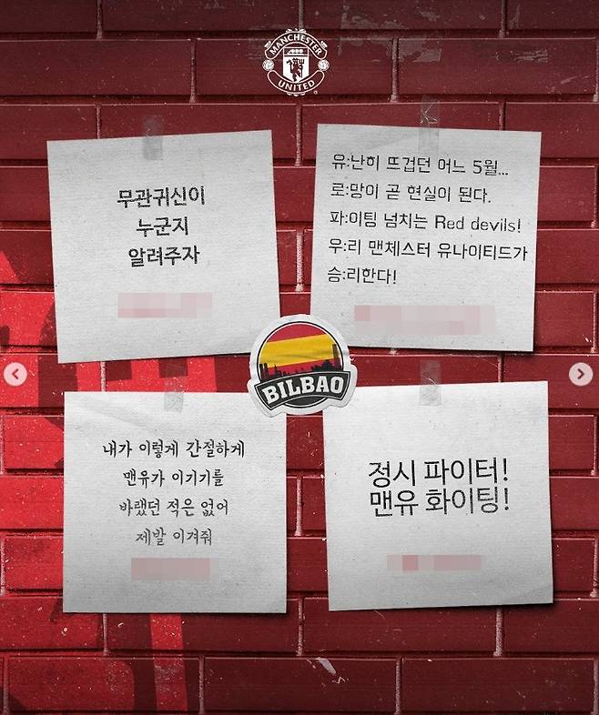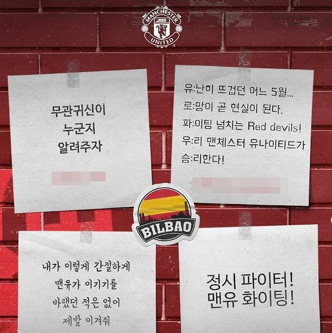 맨유는 21일(한국시간) 구단 공식 사회관계망서비스(SNS)를 통해 한국어로 "맨체스터 유나이티드의 우승을 염원하는 대한민국 팬 여러분들의 응원 메시지! 우리의 붉은 열정이 빌바오에서의 승리로 이어지길 기원합니다!"라고 작성했다.