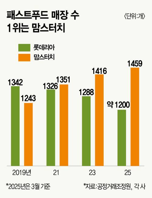 롯데리아는 ‘점포 효율’에 초점을 맞췄다. 롯데리아는 사업 시작 후 41년 동안 적수가 없는 국내 매장 수 1위 브랜드였다. 하지만 코로나 팬데믹이 분기점이 됐다. 2021년 맘스터치에 처음 역전당한 이후 2025년 현재까지도 맘스터치가 1위를 고수하고 있다. 맘스터치와 매장 수 차이는 어느덧 200여개까지 벌어졌다.