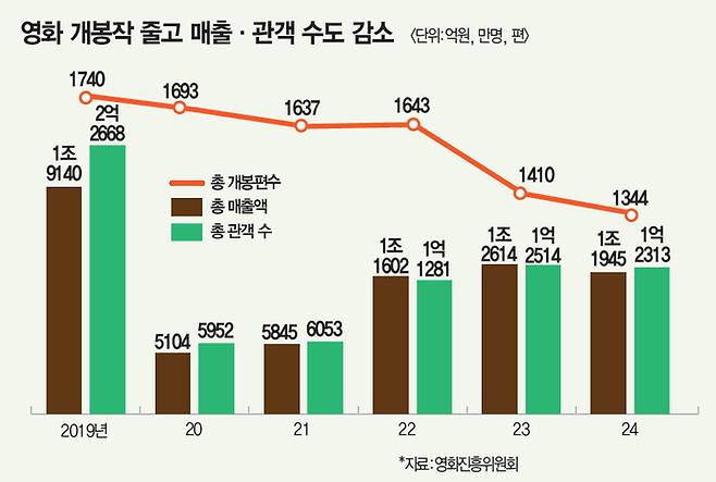 한 영화 업계 관계자는 “지난해 파묘와 범죄도시 흥행으로 한국 영화 시장이 되살아날 것이라는 기대가 커졌지만 실상은 아니었다. 연간 기준으로 따지면 오히려 전체 관객 수가 역성장했고 올해와 내년 전망은 더 부정적”이라고 우려했다.