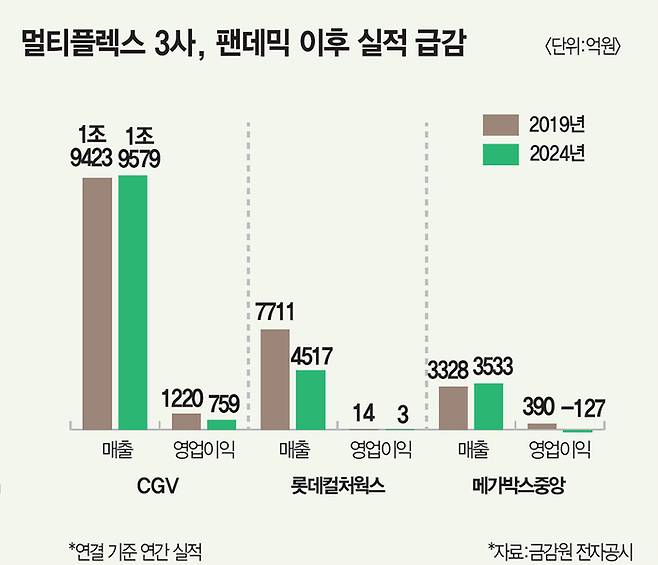 메가박스중앙 상황은 더 심각하다. 팬데믹 이전과 매출은 비슷하지만 수익성이 크게 악화했다. 2019년 영업이익 390억원에서 지난해에는 영업손실 127억원을 기록했다. 2020년 682억원 영업손실을 기록한 이후 4년 연속 적자다.