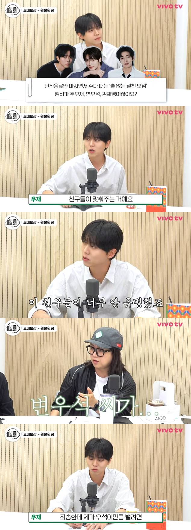 주우재는 "다들 술 안 먹는 친구들은 아니고 제가 술 먹는 걸 싫어해서 친구들이 맞춰준 것"이라고 설명했다. 그러면서 변우석, 김재영은 과음하는 스타일은 아니고 조금씩은 마시는 스타일이라고 부연했다.