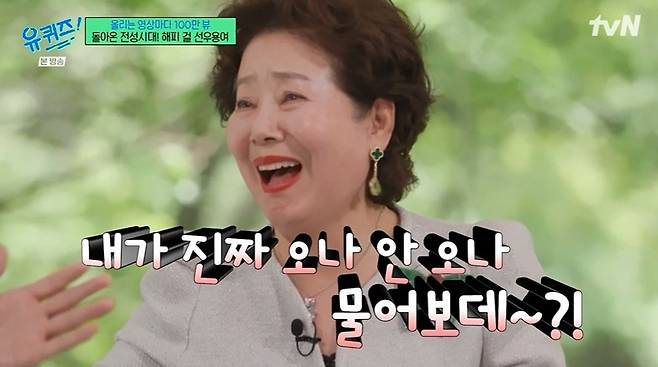 이날 '유퀴즈'에 출연한 선우용여는 출연 섭외가 오자 "왜 이제야 불렀어"라고 했다고 밝혔다. 선우용여는 "정말 기분 나빴어. 다른 사람 다 초대하면서 왜 나를 이제 부르나"라며 "사람이 간사하다. 조금 내가 뜨니까 부르잖아. 그래서 사람은 뜨고 봐야 한다"라고 말해 웃음을 안겼다.