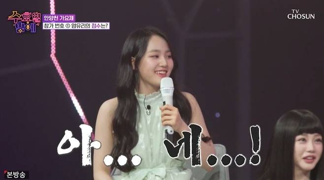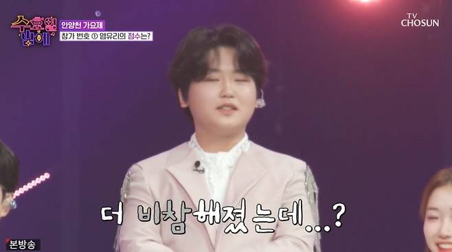 이어 공개된 염유리의 점수는 220점 만점 중 200점이었다. 염유리는 "100점대 아닌 거에 감사하다"라고 전했다. 다음 참가자는 박성온으로, 현재 중학교 3학년이라고 밝혔다. 박성온은 "'미스터트롯2' 때 옷은 못 입는다"라며 "식단 조절과 운동을 하면서 다이어트도 하고 있다"라고 했다.