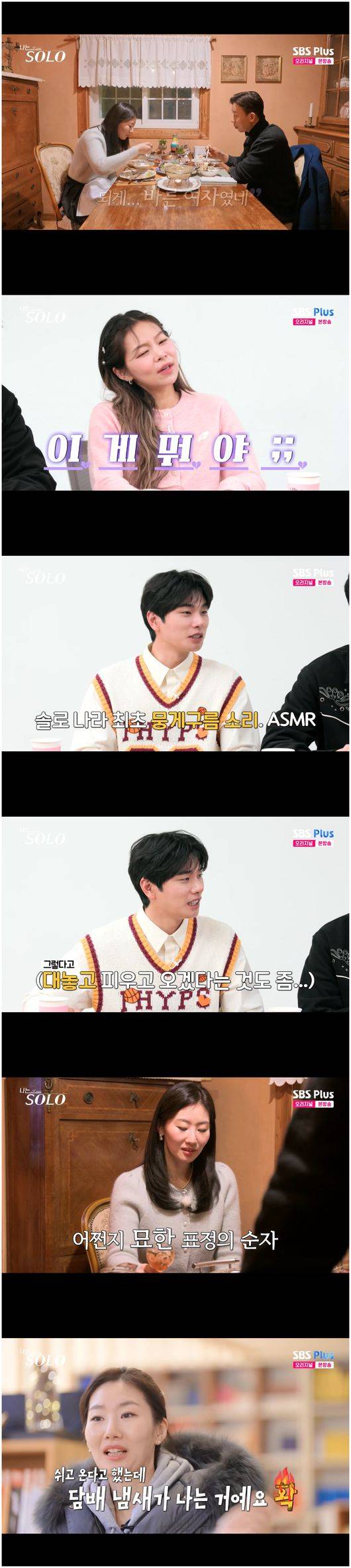 여기까진 화기애애했다. 경수는 돌연 머리가 아프다며 잠시 바깥으로 나갔다. 그 순간 오디오에 울려퍼지는 숨소리가 엠씨들을 자극했다. 이이경은 “솔로나라 최초로 흡연 ASMR은 진짜 처음이다”라며 경악했고, 송해나는 “저건 뭐냐. 데이트 중에 그렇게 담배를 피우러 나갔다고 오는 게 말이 되냐. 너무 예의가 없다”라며 화를 냈다.