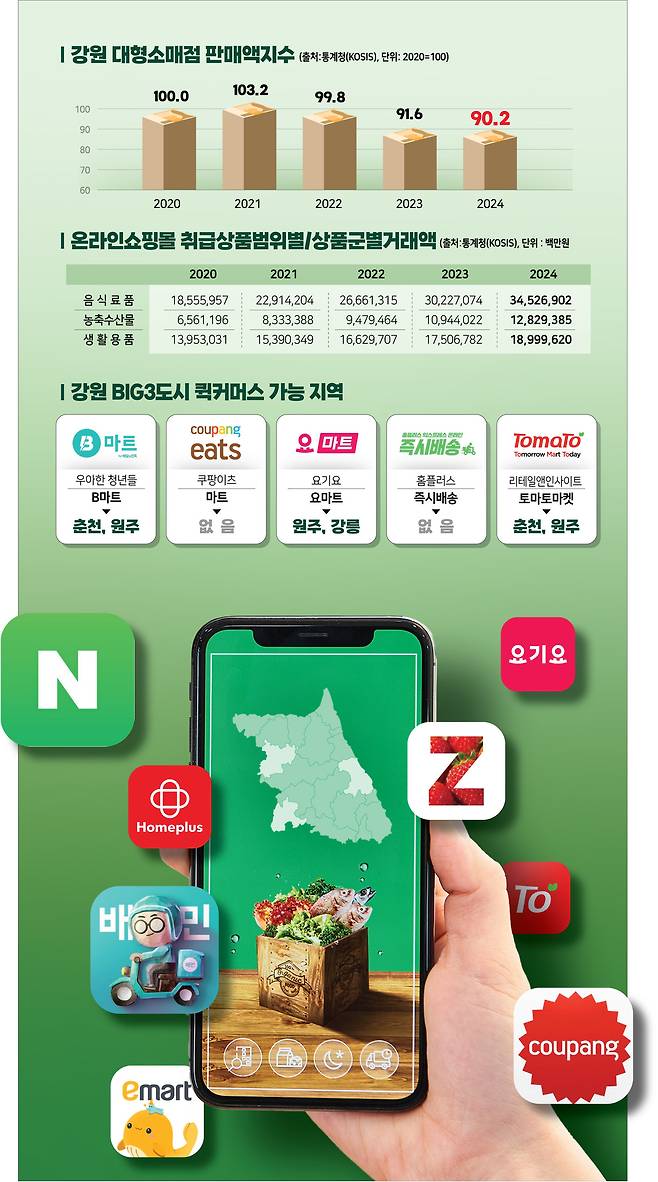 코로나19를 기점으로 온라인 쇼핑 수요가 폭발적으로 늘어나면서 도내 오프라인 유통은 지속적인 하락세를 면치 못하고 있다. 통계청에 따르면 강원도 내 오프라인 대형마트 판매액 지수는 2021년 103.2에서 2022년 99.8, 2023년 91.6, 지난해 90.2로 4년 연속 감소했다. 이는 관련 통계 작성 이래 최저치다.