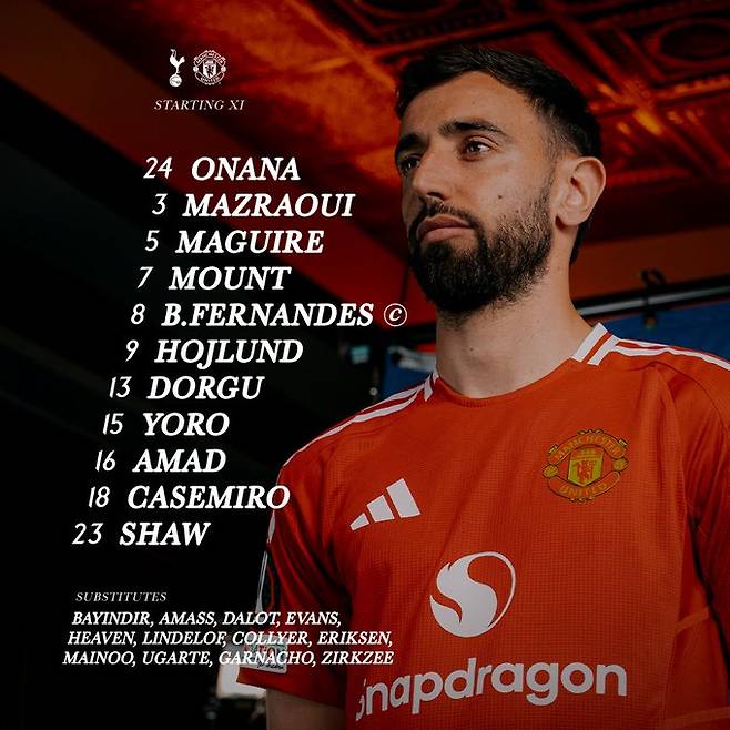 이에 맞서는 맨유는 안드레 오나나가 골문을 지킨다. 누사이르 마즈라위, 해리 매과이어, 메이슨 마운트, 브루노 페르난데스, 라스무스 호일룬, 파트리크 도르구, 요로, 아마드 디알로, 카세미루, 루크 쇼가 토트넘 골문을 겨냥한다.