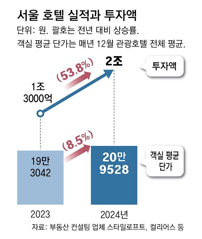 팬데믹 당시 호텔 줄폐업 여파로 호텔 공급은 늘어난 관광 수요를 따라가지 못하는 상황이다. JLL코리아에 따르면 팬데믹 기간 중 서울에서 4, 5성급 호텔 약 4000실이 사라졌다. 호텔 공급 부족에 객실 요금도 오르고 있다. 서울 호텔의 객실 평균 단가는 2019년 12월 13만4000원에서 2024년 12월 21만 원까지 56.7% 올랐다.