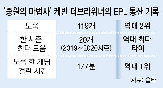 2015년 볼프스부르크(독일)에서 이적한 더브라위너는 맨시티에서 세계적인 미드필더로 활약했다. 그가 몸담은 동안 맨시티는 EPL 우승 6회, 구단 역사상 첫 유럽축구연맹(UEFA) 챔피언스리그 우승 1회 등 19차례나 우승컵을 들어 올렸다.