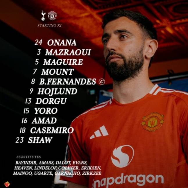일단 시작은 벤치 대기다. 스리톱으로는 도미닉 솔랑케가 스트라이커로 서고 히샤를리송이 손흥민의 왼쪽 측면으로 등장한다. 오른쪽은 브레넌 존슨이 선다. 히샤를리송의 힘으로 일단 전반 맨유 스리백 수비를 공략한 뒤 후반 손흥민의 폭발적인 스피드를 활용하려는 승부수로 보인다.