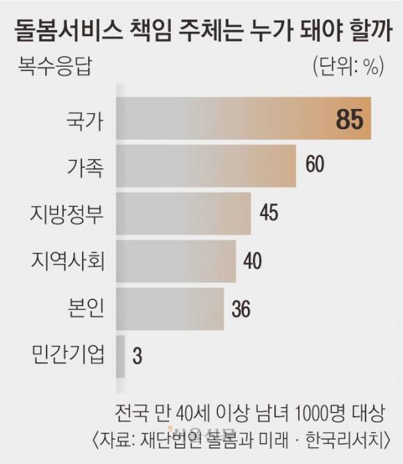 가족이 돌봄을 책임진다는 통념도 옅어지고 있다. 응답자의 85%는 ‘국가가 돌봄의 책임 주체’라고 답했고, 돌봄서비스 확대를 위한 세금 지출에도 같은 비율이 찬성했다. 돌봄을 공공의 책임으로 전환해야 한다는 사회적 요구가 뚜렷이 감지된다.