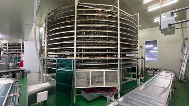 냉각 컨베이어 벨트는 높이가 3.5m 정도로, 설비 프레임이 계속 돌아가면서 갓 만들어진 뜨거운 빵을 식히는 작업을 합니다.