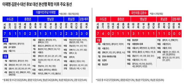 이런 행보는 양 후보 모두 이번 선거에서 수도권과 영남권을 전략적 요충지로 삼고 '효율성 중심'의 유세 전략을 택했기 때문이란 분석이다.