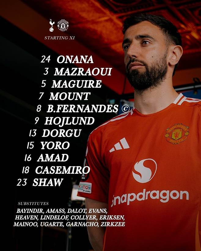 맨유는 라스무스 호일룬을 비롯해 아마드 디알로, 브루노 페르난데스, 마누엘 우가르테, 카세미루, 파트리크 도르구, 누사이르 마즈라위, 요로, 해리 매과이어, 빅토르 린델뢰프, 골키퍼 안드레 오나나가 선발 명단에 이름을 올렸다.