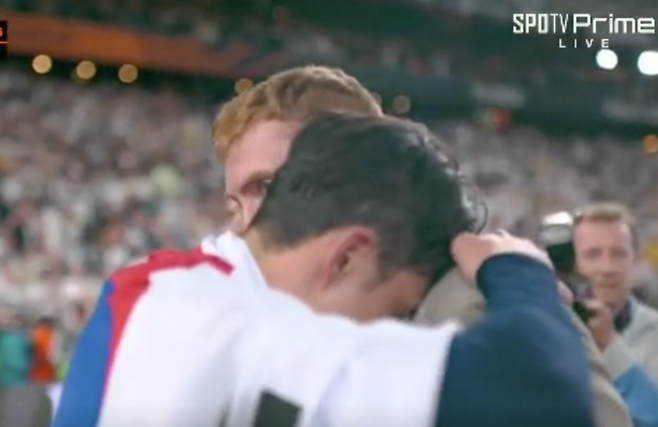 경기 후 손흥민은 태극기를 몸에 두르며 우승을 만끽했다. 태극기를 두르며 세리머니를 하던 중 팀 동료 클루셉스키를 보자 펑펑 눈물을 쏟았다. 10년 동안 토트넘에서 했던 모든 게 파노라마처럼 지나갔을 테다.
