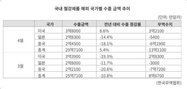 "철강제품 수출 15.6% 급증"...4월 수출액·무역수지·증감률 '트리플 상승'