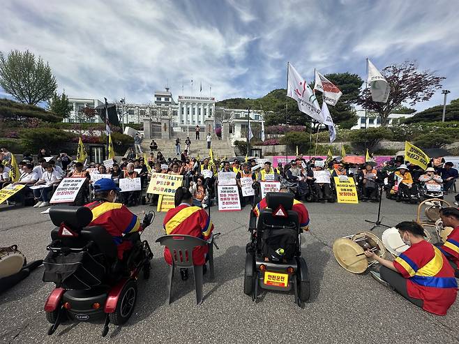 | ▲ 지난달 23일 강원도청 앞에서 강원장애인차별철폐연대, 강원장애인자립생활센터협의회 등 강원지역 장애인 단체들이 장애인권리정책 페스티벌을 열고 있다. |
