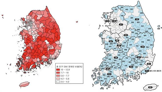 | ▲ 왼쪽부터 인구 대비 장애인 비율, 소멸위기지역이다. |