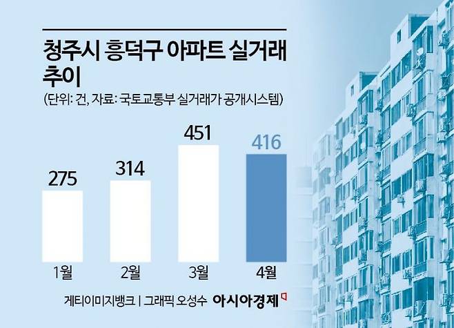 최근에는 세종 인근의 청주 아파트 시장에도 온기가 퍼지고 있다. 특히 정부세종청사까지 차량으로 20~40분 내 이동 가능한 청주시 흥덕구 아파트 거래량 증가가 두드러졌다. 흥덕구에는 KTX·SRT가 지나는 오송역과 오송생명과학단지가 있는 오송읍에 아파트 단지가 있어 주목을 받고 있다. 흥덕구의 아파트 매매 건수는 지난 1월 275건에서 3월에는 451건까지 64% 증가했다. 4월에는 416건으로 소폭 감소했지만 전년 동기 321건과 비교하면 95건 거래량이 늘었다.