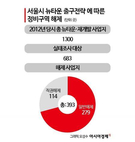 서울시는 2012년부터 '뉴타운·재개발 사업 출구전략'을 통해 당시 서울 내 정비구역 683곳 중 393곳을 해제했다. 주민 결정에 따라 해제된 일반 해제지역이 279곳, 시가 직권 해제한 곳이 114곳이다. 이명박 대통령이 서울시장 재임 당시 무리하게 추진한 뉴타운 사업이 주민 간 갈등을 야기하고 투기 광풍을 낳자 내린 판단이었다. 2012년 당시 서울에 지정됐던 뉴타운·정비사업 대상지는 총 1300곳으로, 이 중 305곳(35개 지구)이 이 시장 재임 중 지정됐다.