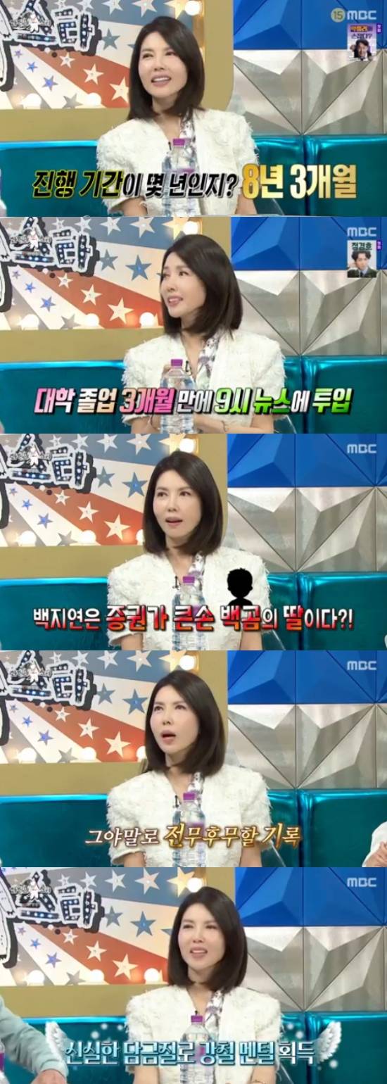 이날 방송에서 백지연은 MBC '뉴스데스크' 앵커로서 최초, 최연소, 최장수 앵커의 타이틀을 보유하고 있음을 전했다.