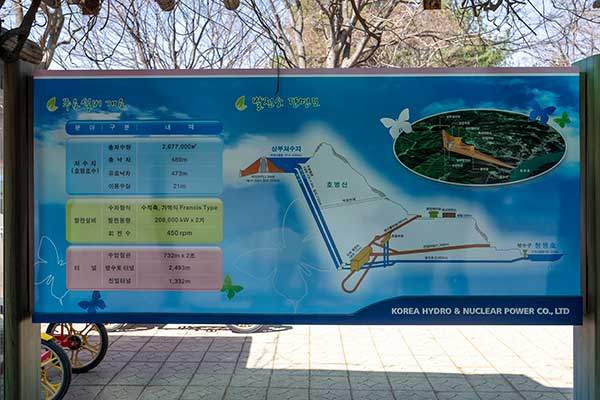 지형도를 보면 호수가 있는 이곳 지형이 상당히 독특한 것을 알 수 있다. 백록담 같은 화산분지처럼 9부능선에 계곡이 완만하게 똬리를 틀고 있어, 좁은 입구만 막으면 호수를 만들 수 있는 지형이다. 북한강과 가깝고, 수도권 변전소도 가까워 양수발전소를 짓기에 천혜의 장소였던 셈이다. 689억 원이 투입되어 5년간의 공사를 거쳐 1980년 완성되었으며, 지금도 당시 원형 그대로다. 산 아래에서 땅 속을 파고, 위에서 구멍을 파서 만났는데, 오차가 6cm밖에 나지 않을 정도로 엄청난 기술력이었다. 일본의 기술을 들여왔으며, 이 공사로 인해 우리나라 건축 기술 발전에 큰 기여를 했다고 한다.
