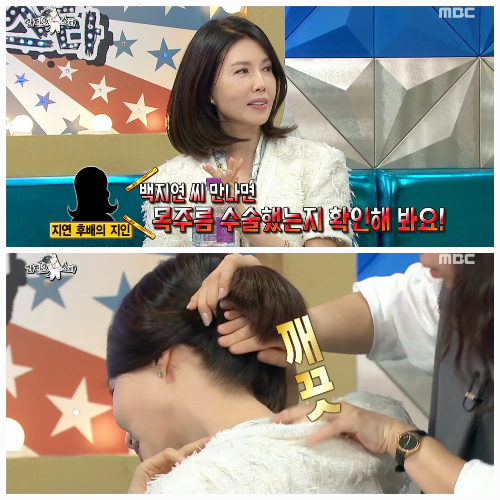 홍현희는 직접 백지연의 목을 살펴본 뒤 "정말 자국 하나 없다. 머리숱도 많고 진짜 대단하다"며 '관리 여신' 인증에 나섰다.