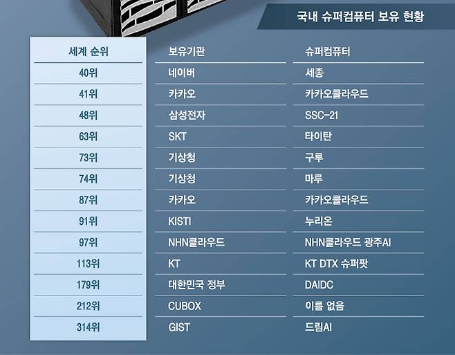 상위권에는 네이버와 카카오, 삼성전자, SK텔레콤 등 대기업이 보유한 슈퍼컴퓨터들이 올라 있다. 기상청과 한국과학기술정보연구원(KISTI) 등 정부기관에서 보유하고 있는 제품도 일부 있다. 국내에서 순위가 가장 높은 네이버의 ‘세종’은 세계 40위다. 세종의 연산 성능은 32.97페타플롭스(PF)로 매우 뛰어나지만, KISTI에 도입 예정인 6호기의 5% 정도에 불과하다.
