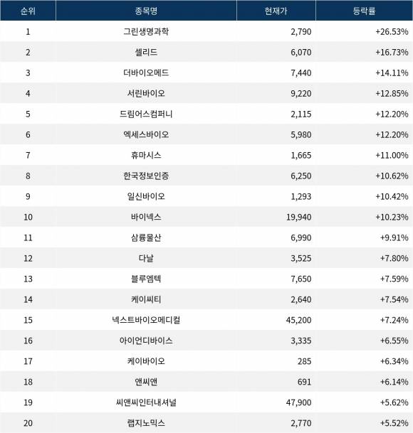 6위 엑세스바이오(950130)는 현재가 5,980원으로 12.20% 상승 중이다. 7위 휴마시스(205470)는 현재가 1,665원으로 11.00% 상승 중이다. 8위 한국정보인증(053300)은 현재가 6,250원으로 10.62% 상승 중이다. 9위 일신바이오(068330)는 현재가 1,293원으로 10.42% 상승 중이다. 10위 바이넥스(053030)는 현재가 19,940원으로 10.23% 상승 중이다.