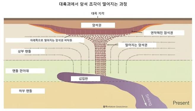 지각 바닥 암석층 조각이 맨틀로 흘러내려