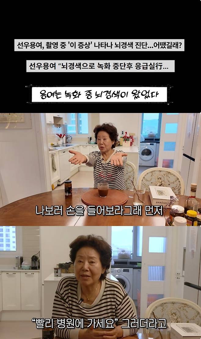 다행히 선우용여는 당시 의사들이 출연하는 건강 프로그램 녹화 중이었다고. 손을 들어보라는 의사의 요청에 손이 잘 들어지지 않자, 급히 병원을 찾았다.