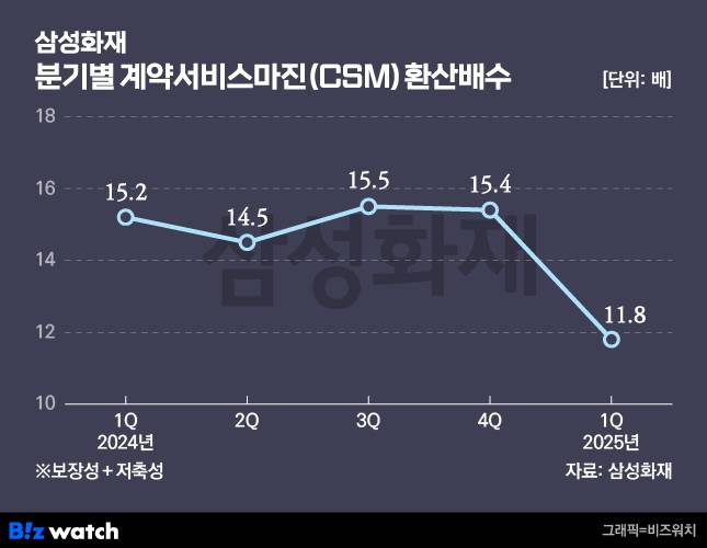 삼성화재 1분기 장기보험 신계약 CSM 환산배수는 11.8배(보장성+저축성)를 기록했다. 지난해 분기 평균이 15배 수준이었다는 점을 감안하면 악화된 숫자다.
