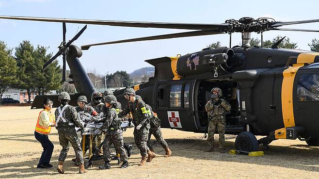이번 훈련은 한미 양측이 유사시 대량전상자를 현장에서 응급처치하고, 헬기와 수송기 등으로 후송하기 위한 협조 및 지원 체계를 검증하기 위해 실시됐습니다.