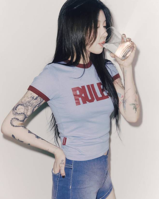 더벌룬티어스의 백예린은 슬림한 핏감의 링거 티셔츠와 데님 숏팬츠를 착용했다. 트레이드 마크인 타투와 어우러져 도발적인 무드를 연출했다.