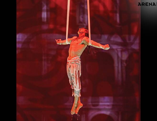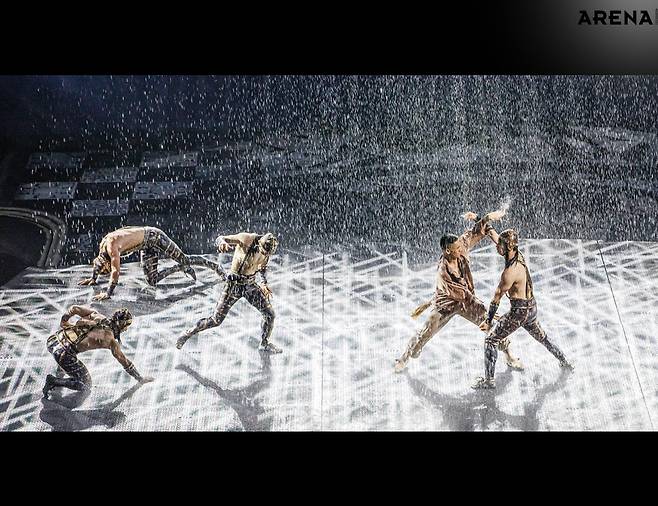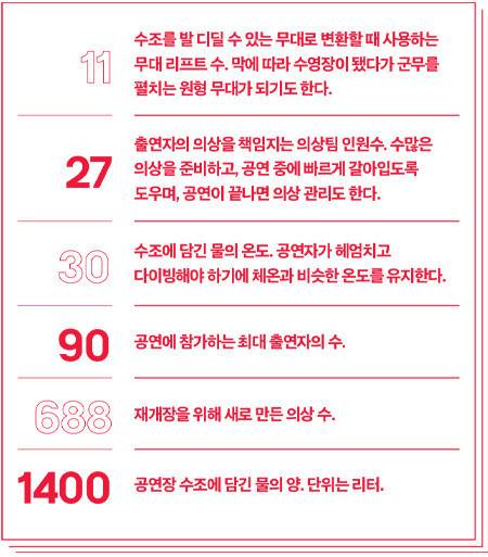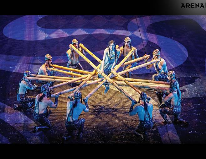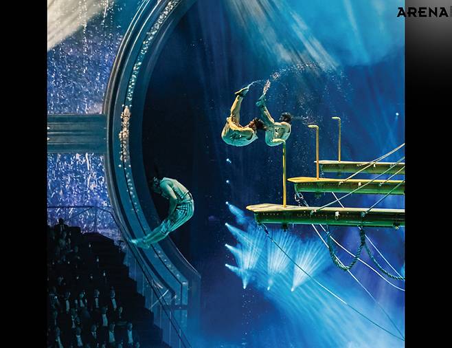몇 가지 정보를 읊자면 이렇다. <하우스 오브 댄싱 워터>는 2010년에 개막했다. 지금까지 공연 횟수는 4000회. 투자금은 20억 위안(한화 약 4011억). 전 세계 30개국 이상에서 모인 300여 명의 스태프. 다이빙, 공중곡예, 체조, 춤, 기예, 레이저 쇼, 미디어아트 등 종합 엔터테인먼트를 구현했다. 시티 오브 드림스를 세운 멜코 리조트 & 엔터테인먼트가 야심 차게 준비한 엔터테인먼트의 극치랄까. 팬데믹 때 중단한 후 개막 15주년을 맞아 다시 막을 올리기로 했다. 공연 전에 블루카펫 행사도 열렸다(물이 테마라 레드가 아닌 블루). 재개장하는 쇼를 빛내기 위해 중화권 스타가 줄지어 참석했다. 서기, 장백지, 진혜림을 비롯해 비(정지훈)까지. 마카오에서, 시트 오브 드림스에서 <하우스 오브 댄싱 워터>가 어떤 의미인지 알 수 있는 장면이었다. 공연장 앞에 점점 사람들이 몰려들었다. 한껏 멋을 내고 온 사람들이 자기 모습을 스마트폰으로 연신 담아냈다. 손에 든 샴페인 잔이 조명에 반짝였다. 시작하기도 전에 충분히 화려했다. 그 반짝임을 품고 공연장으로 들어섰다. 공연장은 크고 독특했다. 270도 원형 좌석이 있고, 가운데 커다란 수조도 있었다. 제목처럼 물이 주가 되는 공연이니까. 공연장 넓이보다 천장이 무척 높은 점도 특이했다. 하지만 공연장만 봤을 땐 어떤 식으로 공연을 펼칠지 알 수 없었다. 그냥 가운데 수조의 물만 바라보며 기대할 뿐이었다. 이 넓은 공간과 물을 어떻게 활용할까. 무엇을 보여줄까. 얼마나 화려할까. 이런 생각을 떠올리는 사이 공연이 시작됐다. 수조 위를 나룻배 하나가 가로질렀다. 규모가 엄청난 공연장의 시작으로는 꽤 서정적이었다.