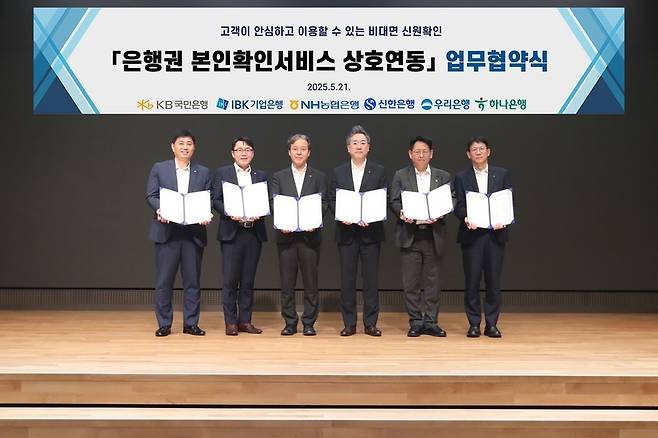 [신한·KB국민·하나·우리·NH농협·IBK기업은행 등 6개 시중은행이 21일 서울 중구 우리은행 본점에서 '은행권 공동 본인확인 서비스' 제공을 위한 업무협약을 맺었다. (자료=6개 은행 공동)]