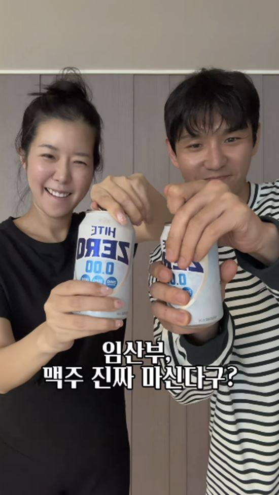 영상 속 김지혜와 남편 최성욱은 무알콜 맥주 캔을 들고 환하게 웃고 있는 모습.