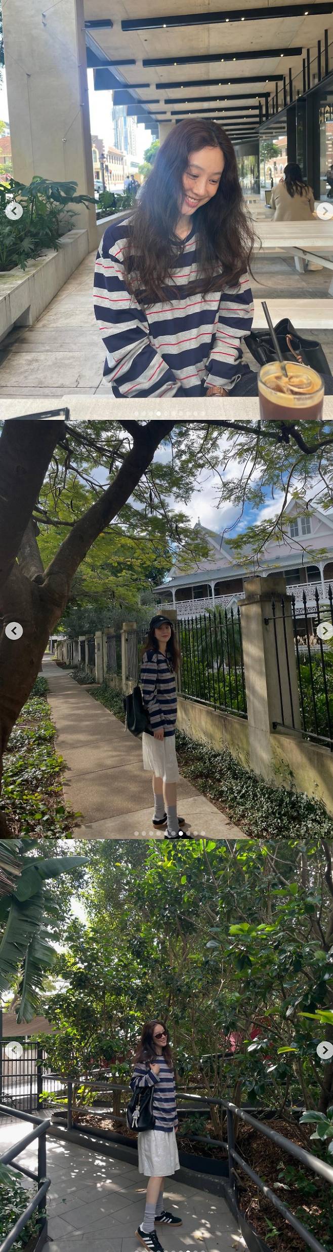 사진 속 정려원은 편안한 스트라이프 티셔츠에 흰색 스커트를 매치한 내추럴한 룩으로 도심 속 산책을 즐기고 있다. 모자와 백팩으로 포인트를 더한 캐주얼한 스타일이 눈길을 끈다.