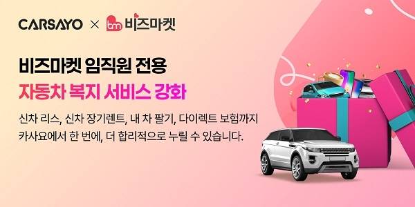 자동차 쇼핑 통합 플랫폼 카사요(주)가 최고의 Buying Power(구매력)와 상품 소싱력, 가격 경쟁력을 바탕으로, 선택적 복지 시스템 서비스를 이용하는 이용자 수가 2,000만 명에 달하는 비즈마켓(구 인터파크 비즈마켓)과의 업무 협약을 통해 다양한 혜택을 임직원 및 회원사에 제공한다고 공지했다. 기존에 제공되던 자동차 관련 통합 서비스를 그대로 유지함과 동시에, 파트너십을 체결한 비즈마켓 회원사에도 동일한 혜택을 제공하며, 신차 구매, 리스, 장기렌트, 내차팔기, 다이렉트 자동차 보험 비교 가입 등 다양하고 개인 맞춤형 최저가 솔루션을 제공한다고 밝혀, 복지몰 서비스 영역을 한층 넓히는 계기가 되었다.