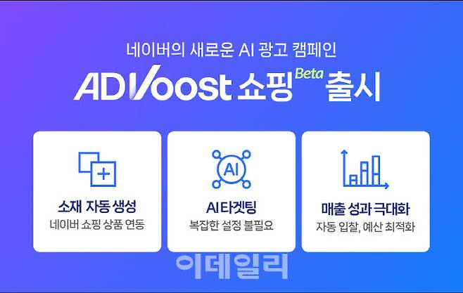 [이데일리 김아름 기자] 네이버(NAVER(035420))는 AI로 쇼핑 광고 캠페인 효율을 높이고 운영 부담은 낮춰주는 ‘애드부스트 쇼핑(ADVoost shopping)’을 오픈 베타로 선보인다고 22일 밝혔다.