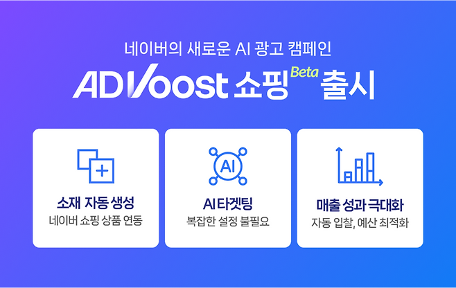 네이버는 인공지능(AI)으로 쇼핑 광고 캠페인 효율을 높이고 운영 부담은 낮춰주는 ‘애드부스트 쇼핑(ADVoost shopping)’을 오픈 베타로 선보인다고 오늘(22일) 밝혔습니다.
