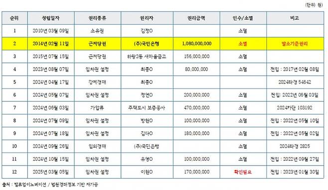 해당 부동산의 소유자는 김정○(1953년생)이며, 2014년 2월 11일 설정된 국민은행의 근저당권(10억8,000만원)이 말소기준권리입니다.