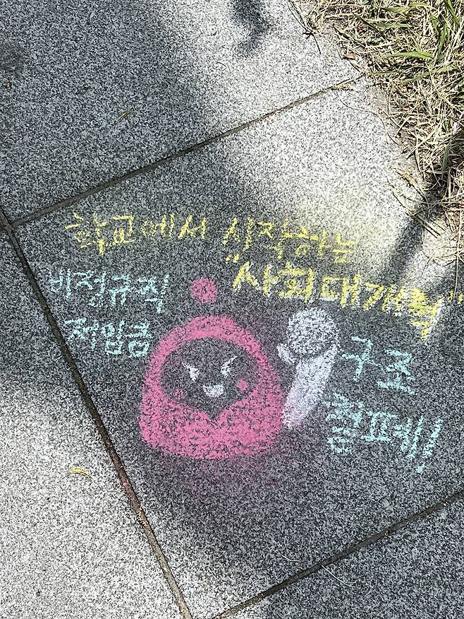 | ▲ 학교에서 시작되는 사회대개혁 지난 4월 학교비정규직 노동자들이 단식농성을 진행하던 정부종합청사 앞에 한 시민이 그린 그림 |