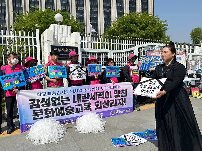 | ▲ 내란세력이 망친 문화예술교육 되살리자! 예술강사들이 학교예술교육 예산 삭감을 규탄하며 퍼포먼스를 진행하고 있다. |