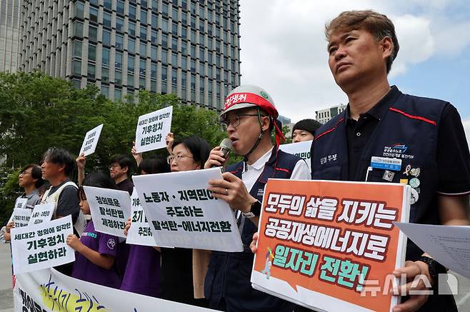 [서울=뉴시스] 배훈식 기자 = 탈석탄법 제정을 위한 시민사회연대 참여자들이 22일 오전 서울 종로구 광화문광장에서 기후위기 극복을 위한 '정의로운 탈석탄법' 제정 촉구 기자회견을 하고 있다. 2025.05.22. dahora83@newsis.com
