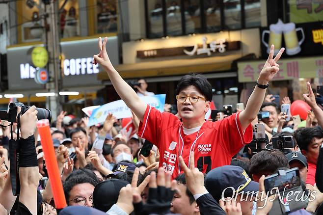 | ▲ 21일 오후 대구 서문시장을 방문한 한동훈 국민의힘 전 대표가 지지자들을 향해 두 손을 들어 인사하고 있다. |