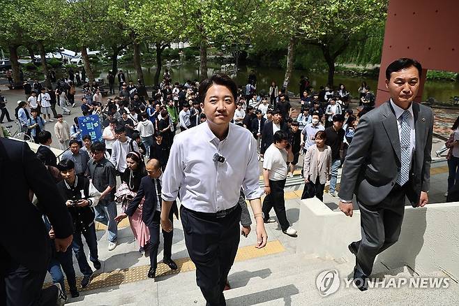 (인천=연합뉴스) 윤동진 기자 = 개혁신당 이준석 대선 후보가 22일 '학식먹자 이준석' 행사가 열린 인천 미추홀구 인하대학교를 방문해 이동하고 있다. 2025.5.22