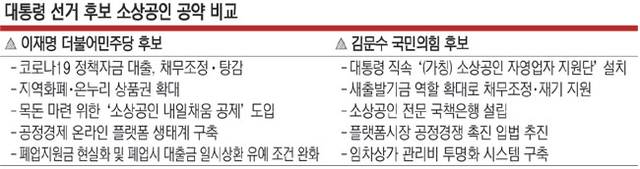 더불어민주당·국민의힘 대통령 선거 후보는 모두 경제 공약 중 소상공인 공약을 별도로 발표하고 채무 조정 및 소비 촉진 활성화 등을 약속했다. 이재명 민주당 후보는 ‘공정경제 실현’에 방점을 뒀고 김문수 국민의힘 후보는 ‘경쟁력 강화’에 더 초점을 맞췄다.