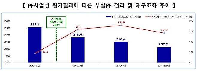 지난해 하반기부터 본격적으로 부실 PF 사업장 정리나 재구조화에 착수한 결과 작년 말 전체 PF 익스포져는 6개월 만에 14조2000억원(6.6%) 줄었고, 부실 PF 규모도 1조8000억원(8.6%) 감소했습니다.