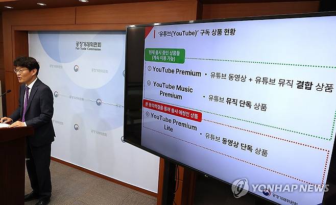 (세종=연합뉴스) 배재만 기자 = 공정거래위원회 김문식 시장감시국장이 22일 정부세종청사 공정위 기자실에서 구글이 위반 혐의와 관련해 신청한 동의의결 절차를 개시하기로 결정했다고 밝히고 있다. 유튜브 서비스를 제공하는 구글이 유튜브 동영상 서비스와 음악 서비스가 결합한 '유튜브 프리미엄'과 유튜브 음악 단독 서비스인 '유튜브뮤직프리미엄'상품만을 판매하고 유튜브 동영상 단독 상품은 판매하지 않은 것에 대해 공정위의 조사가 실시되자 구글이 공정위에 동의의결을 신청했다. 신청안은 소비자의 선택권 확대를 위해 유튜브 동영상 단독 상품을 현재 해외에서 출시된 '유튜브프리미엄라이트' 요금제와 동일한 상품으로 출시한다는 것이다. 2025.5.22