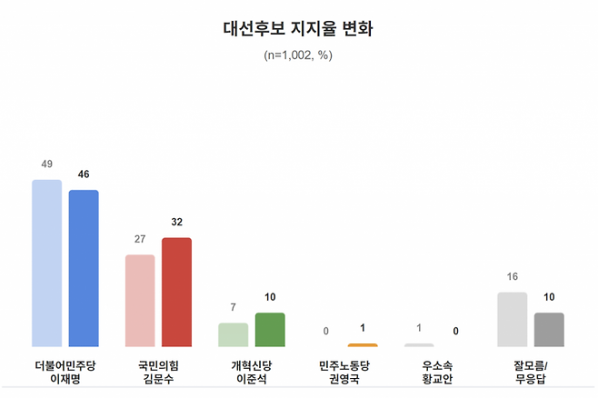 6·3 대통령 선거와 관련해 이재명 더불어민주당 대통령 후보 지지율이 소폭 하락한 가운데 김문수 국민의힘 대선후보와 이준석 개혁신당 대선후보 지지율이 상승했다.